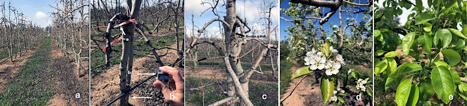 Experimental site and measured trait parameters in the ‘Santa Maria’ pear orchard. a, dormant trees; b, marked trees; c, vegetative and floral buds; d, open flowers; e, fruit set.